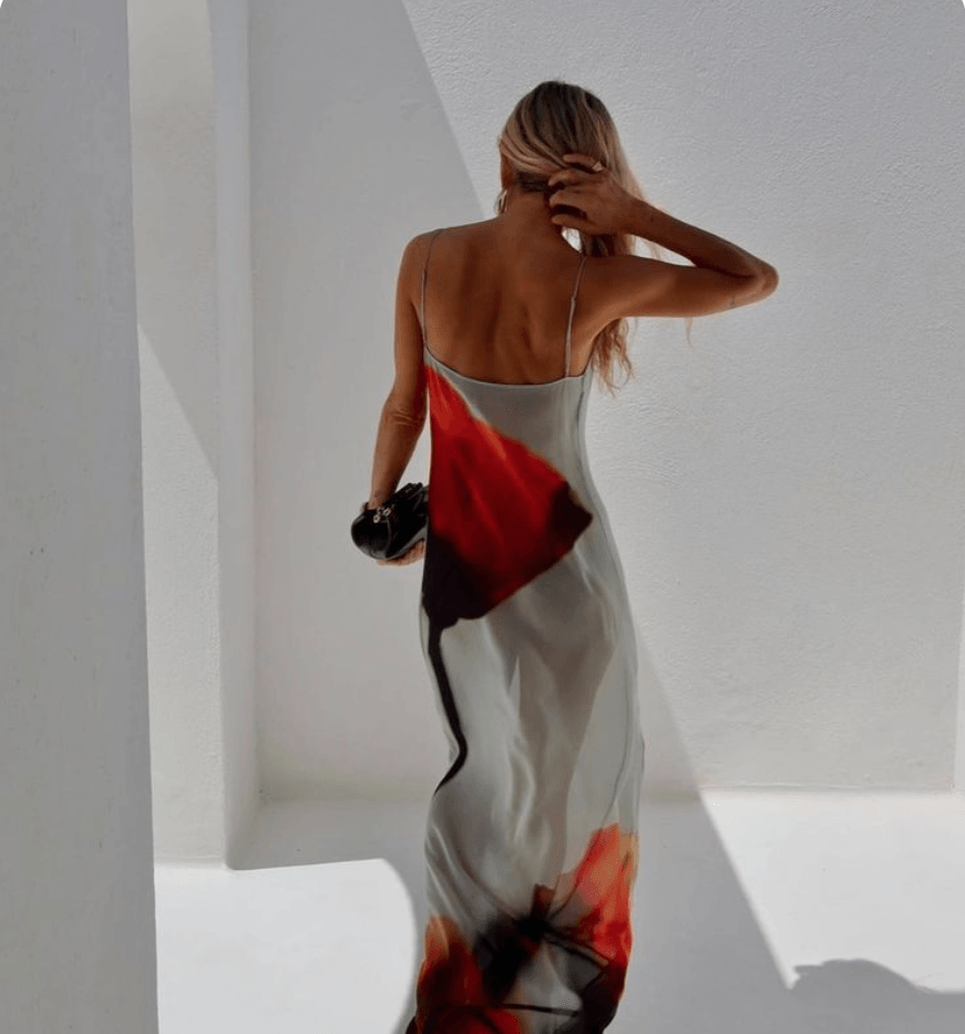 • Artistic Design: The Aurora Dress features a beautiful, oversized red flower print that stands out against a soft, gradient background, creating a piece of wearable art.
