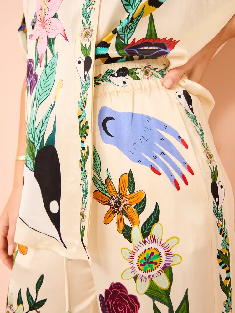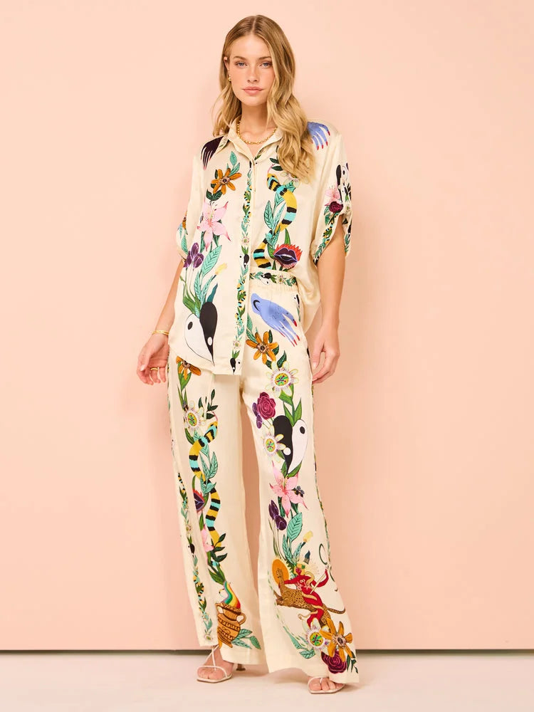 Embrace bold elegance with the Georgia Two-Piece Set, where comfort meets statement style. Designed in a silky-smooth fabric with vibrant floral and artistic prints, this set brings a touch of luxury to your everyday look. The relaxed-fit shirt and wide-leg trousers create a chic yet effortless silhouette, perfect for lounging in style or stepping out with confidence. Dress it up with heels or keep it casual with flats—either way, you’ll turn heads.